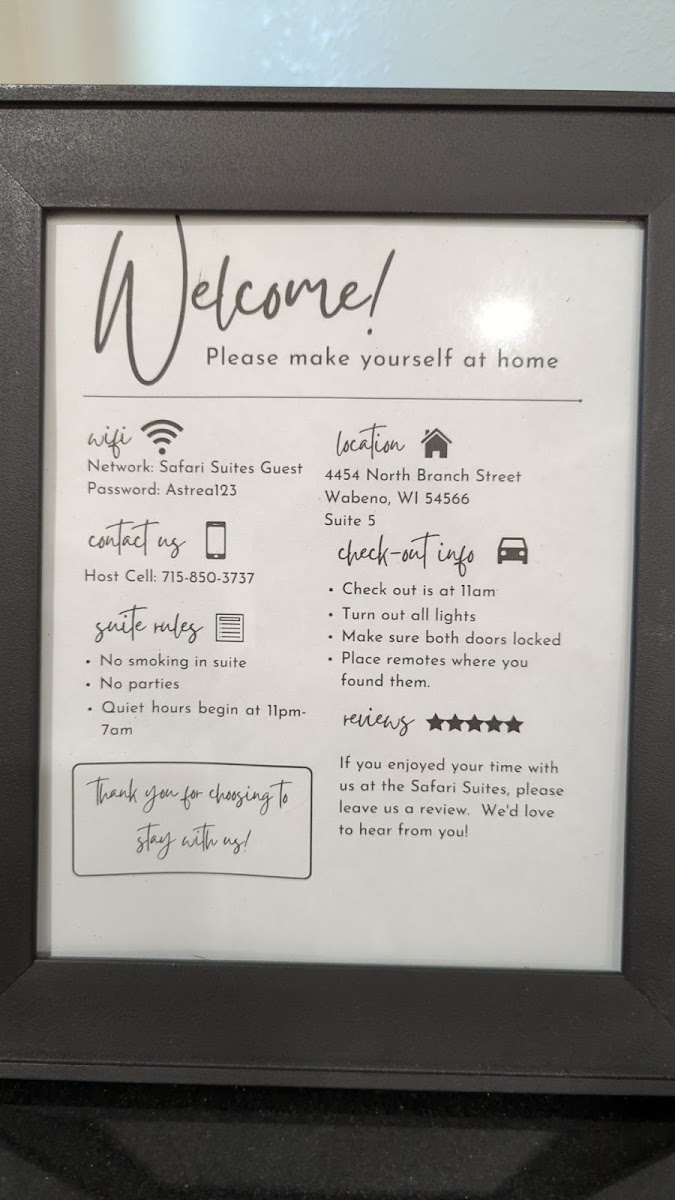 Overall, Safari Suites offers more than just a place to sleep. It embodies the quiet resilience of the Northwoods: updated, clean, and welcoming without pretense. This makes it suitable for guests who value a genuine, grounded experience over luxury—perfect for those who find charm in simplicity and the natural surroundings.